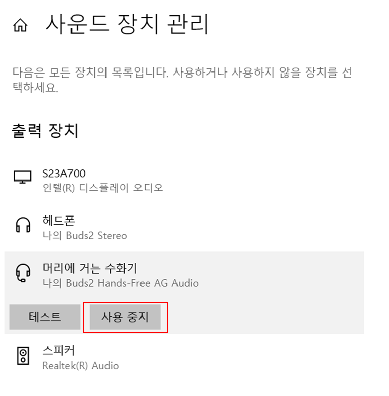 3. 출력 장치에 '머리에 거는 수화기'가 있다면 '사용 중지'를 클릭합니다.