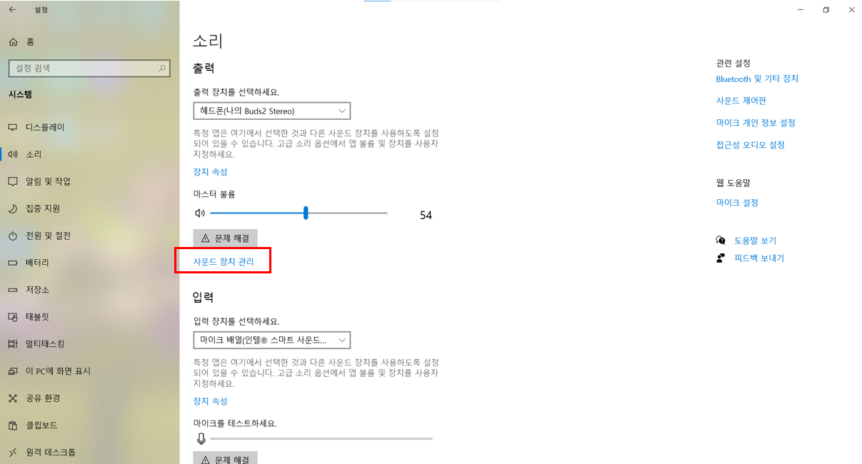 2. 중간 쯤에 '사운드 장치 관리'를 클릭합니다.