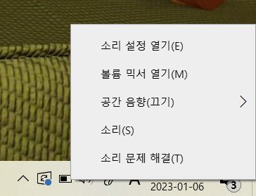 1. 우측 하단 볼륨 아이콘에 우클릭을 하고 '볼륨 설정 열기'를 클릭합니다.