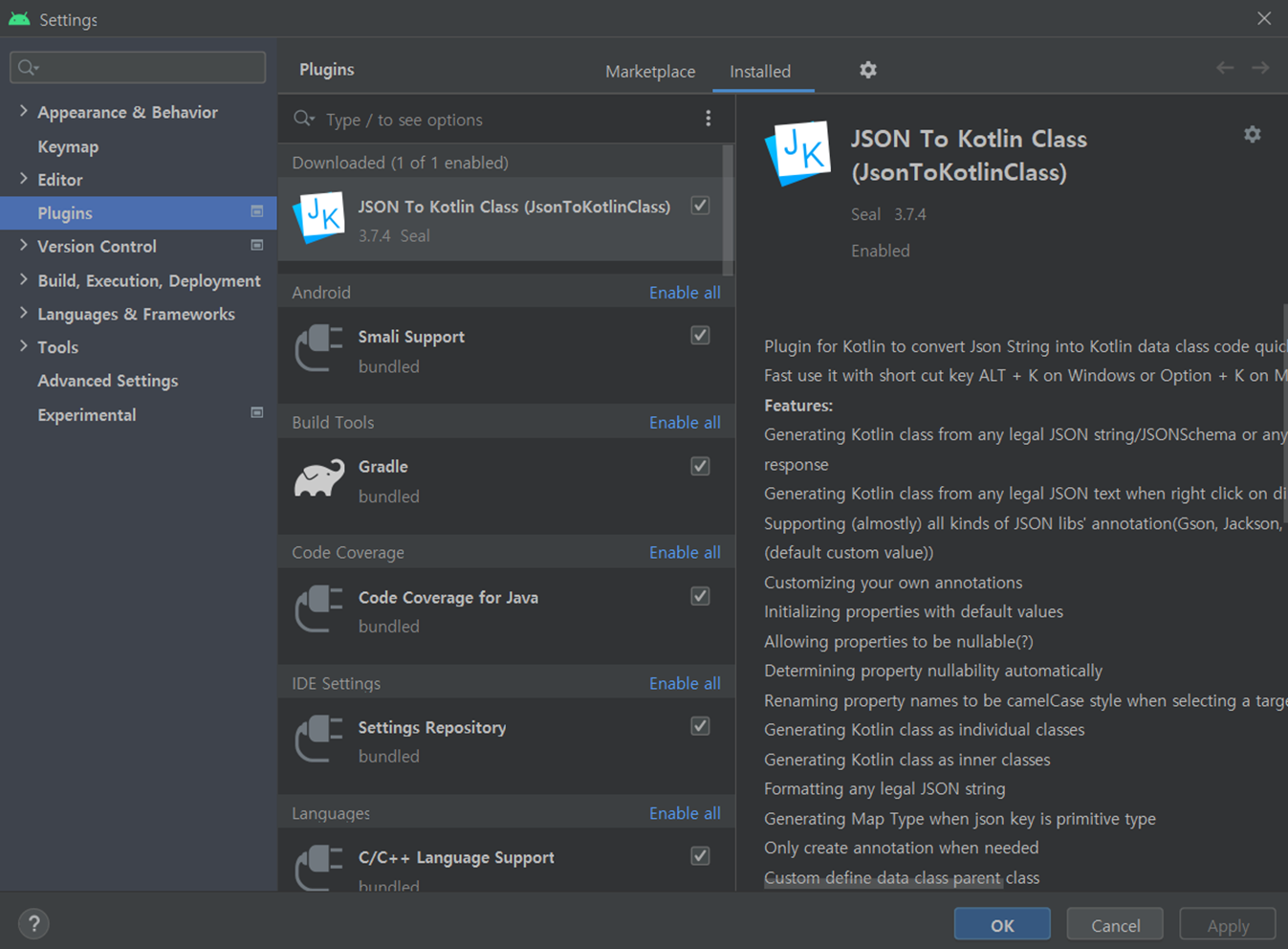 안드로이드 스튜디오에는 JSON 형식의 파일을 data class로 변환해 주는 JSON to Kotlin Class 플러그인이 존재합니다.