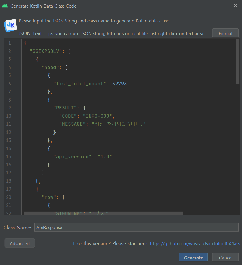 JSON 형식의 샘플을 데이터 클래스로 생성하기 위해 해당 주소에서 샘플을 복사합니다.