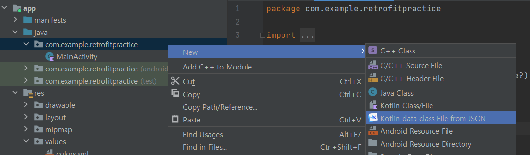 data class를 생성할 패키지에서 위에서 복사한 JSON 샘플을 변환합니다.