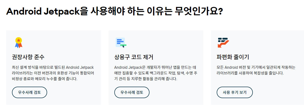 구글은 위와 같은 이유로 JetPack 라이브러리 사용을 적극 권장하고 있습니다.