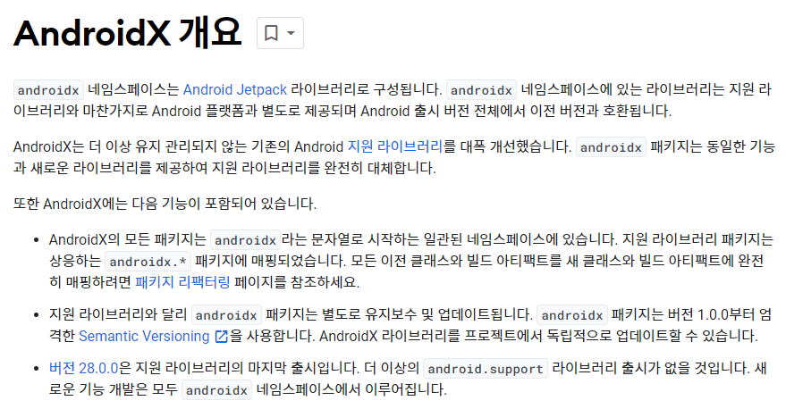 또한, androidx로 패키지화되어 있기 때문에 안드로이드 플랫폼 API와 분리되어 안드로이드 버전에 관계없이 호환된다는 특징이 있습니다. API와 분리되어 있으면 플랫폼 버전에 제한을 받지 않고, 항상 최신 버전의 androidx 패키지에 접근할 수 있다는 장점이 있습니다.