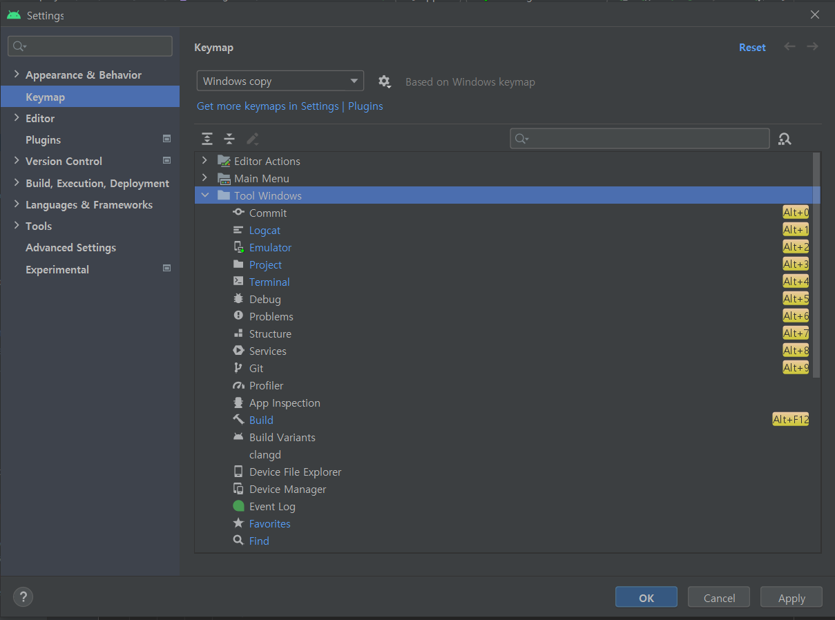 1. 먼저 Ctrl + Alt + S를 눌러 Settings → Keymap → Tool Windows로 이동합니다.